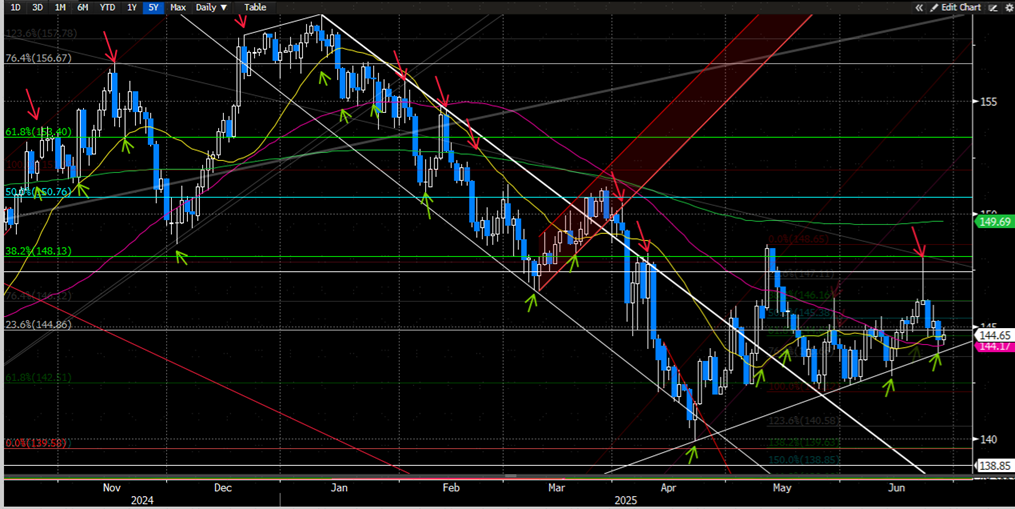 一路走高至3年新高上周初中东局势的明显缓和带动了市场风险偏好明显回暖,而随后鲍威尔在国会听证会上不排除7月降息的表态,以及德国新政府批准预算草案大幅增加新增借贷的计划都助推欧元涨至新高,总体看,欧元继续了年初以来的上行趋势,在美元上周整体走弱背景下,欧元上周大幅收涨0.69%左右。往前看,我们认为欧元/美元的走势或继续受欧美经济的相对表现、欧美央行降息预期的变动以及美国关税政策对市场整体风险偏好的影响等多重因素的综合影响。